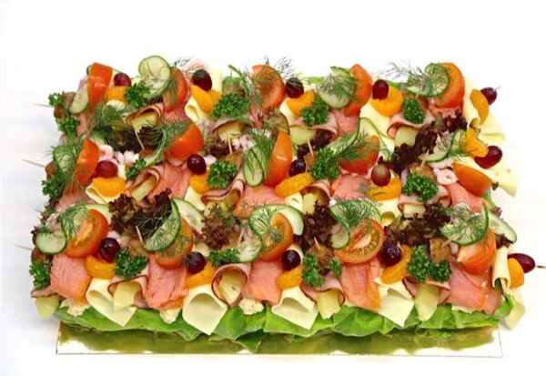 Dekorerad med ost, skinka, köttbullar, lax, handskalade räkor, ägg, grönsaker och frukt.